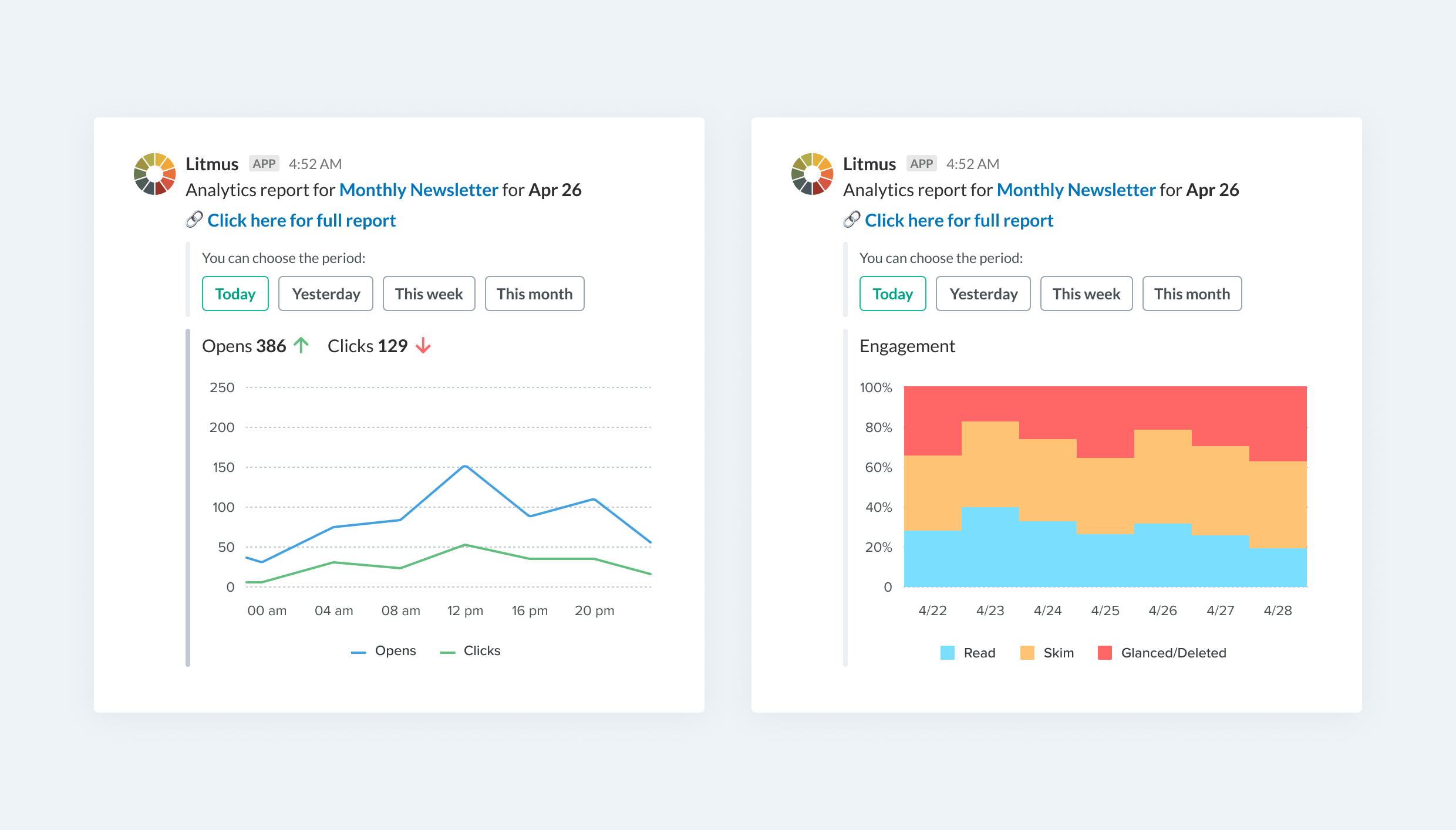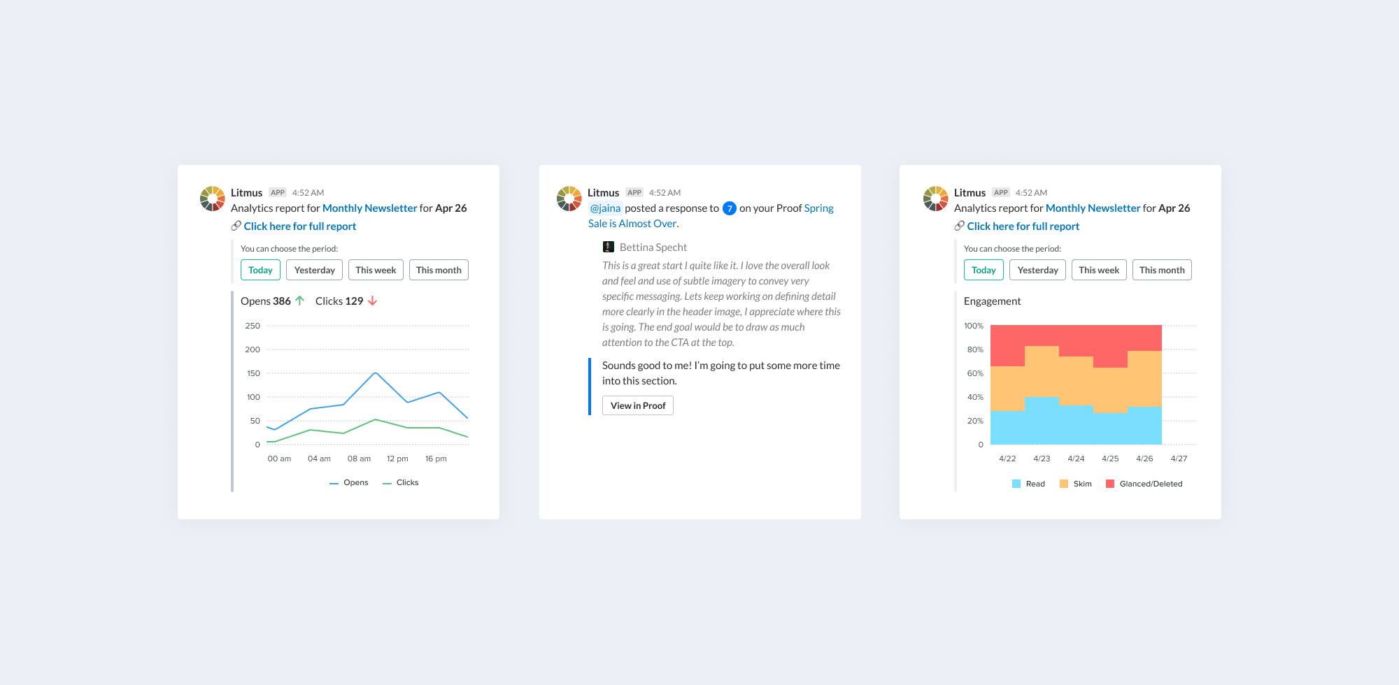 This was an opportunity for Litmus to position itself as a collaborative platform where teams worked together to achieve goals instead of just a specialized tool for email developers. The Slack App would provide timely notifications of Litmus activity to teams using Slack, including weekly reports, incident alerts and comments.